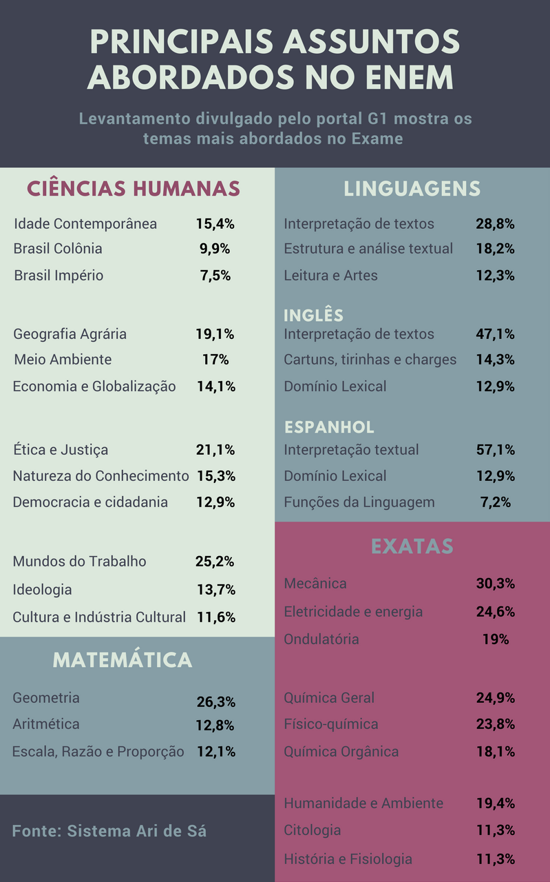 Um estudo divulgado pelo portal G1 analisou as provas do Exame Nacional do Ensino Médio (Enem) entre os anos de 2009 a 2016. O objetivo foi fazer um levantamento das questões que aparecem no exame. Com isso, foi possível observar, entre as 3.076 questões, os temas que mais são cobrados no Enem.