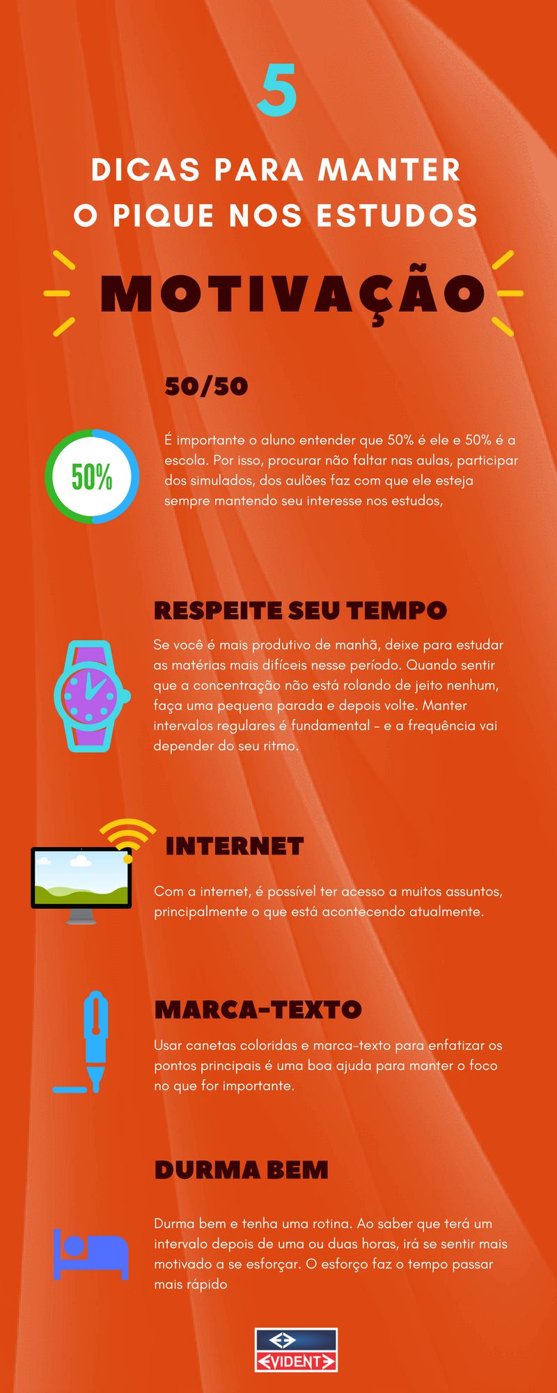 Diversas unidades do Curso Evidente oferecem ferramentas extras para procurar ajudar o aluno a se manter motivado, como os aulões sem custo que procura reunir todos os alunos e reforçar conteúdos aprendidos em sala. Além dos murais com dicas importantes sobre as provas, e o melhor: todos os alunos podem participar. A área do aluno, onde o Evidente coloca materiais e/ou atividades extras daquilo que o aluno já tem em sala de aula, também é uma ferramenta que busca interagir com o aluno e mantê-lo sempre em contato com a escola, não só em sala de aula.