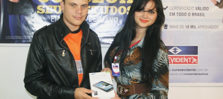 Saiu o resultado da promoção “Curta e Compartilhe” do Curso Evidente. O sorteado foi Jhoni Damiani Oliveira, 21 anos. Ele foi aluno da unidade Xaxim, em Curitiba, e recebeu o tablet Samsung Galaxy das mãos da administradora da escola, Renata Ramos Procópio.