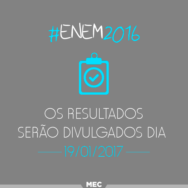 O MEC informou hoje, 04/01, que o resultado das provas dos ENEM realizadas nos dias 5 e 6 de novembro de 2016 serão divulgados no dia 19/01/2017.